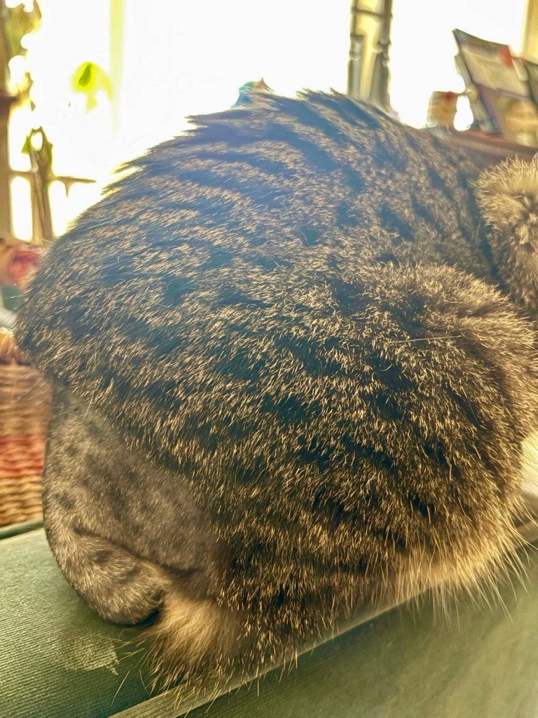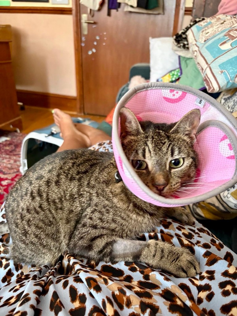Mothra is continuing to recover well from her tail amputation. She’s eating and drinking fine, clambering on furniture, and she’s even managing to tuck her little stumpy tail around her arse when she sits down: