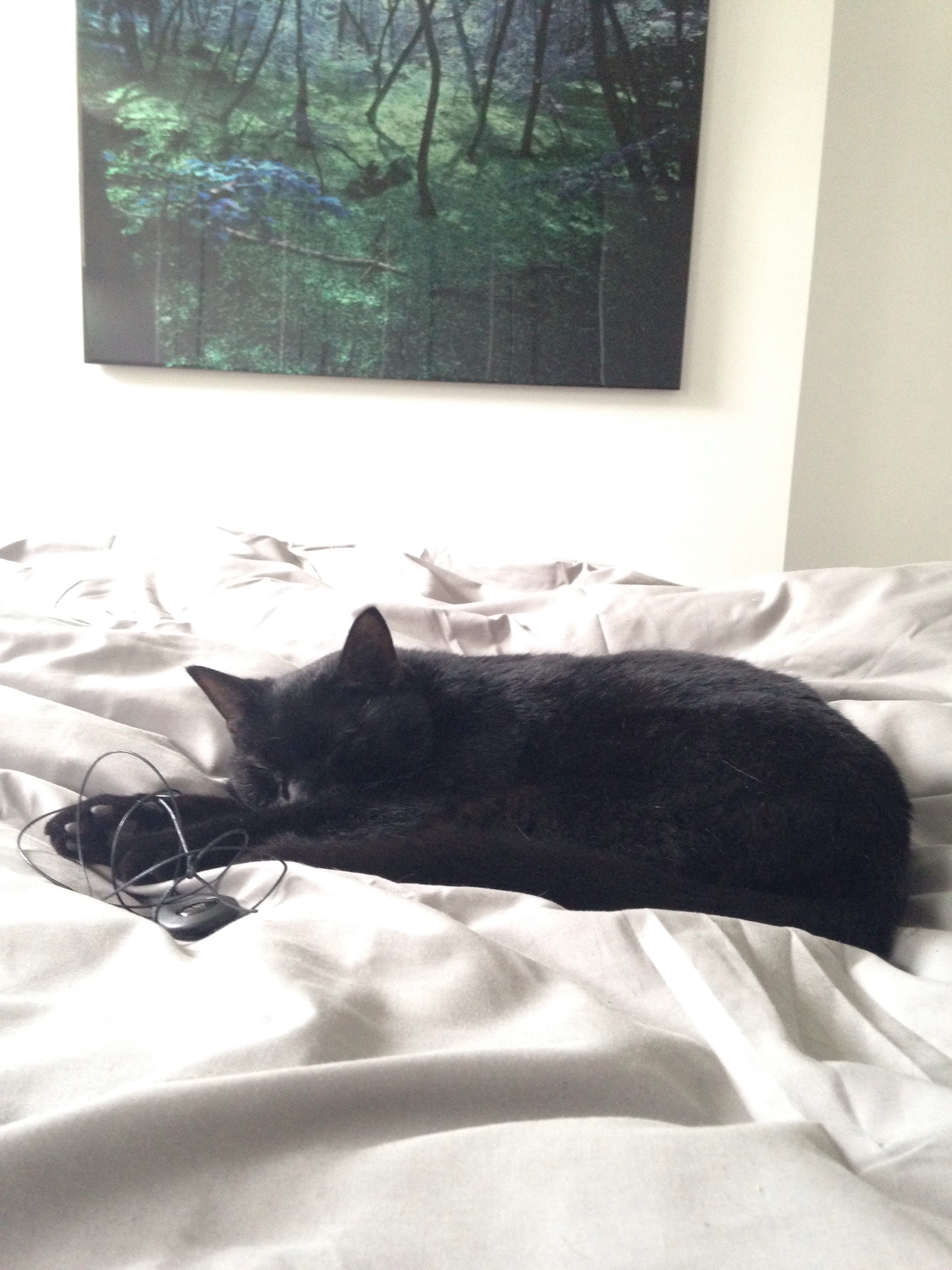 Whether you believe in alternative medicine or not, something about the pendant is drawing Louis Catorze. I left them both on the bed this morning about 5cm apart, and my boy had his back to the pendant. This is how I found them when I returned: