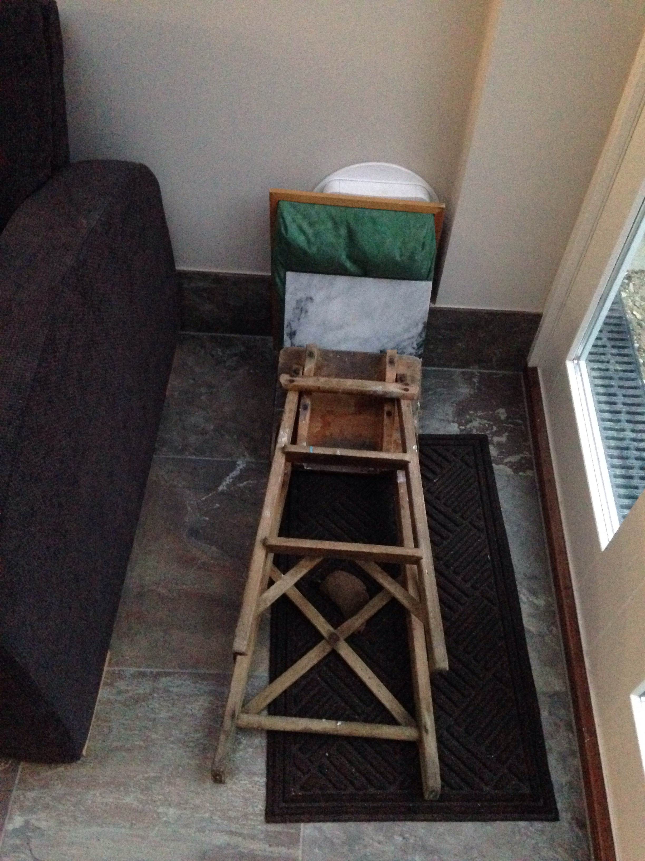 I decided to physically block off the cat flap by leaning a marble cheese board against it, to prevent him from constantly walloping his sore face against it to try and open it, but his response to this was to headbutt the blockade instead. So, because I was scared of the heavy cheese board toppling and crushing him, I’ve had to add a cushioned tray and a step ladder into the mix. I’m fully aware of how ridiculous it looks, but the alternative is him snorting outdoor dust and cobwebs, ending up with infected wounds on his face and having to play the Game of Cônes again.