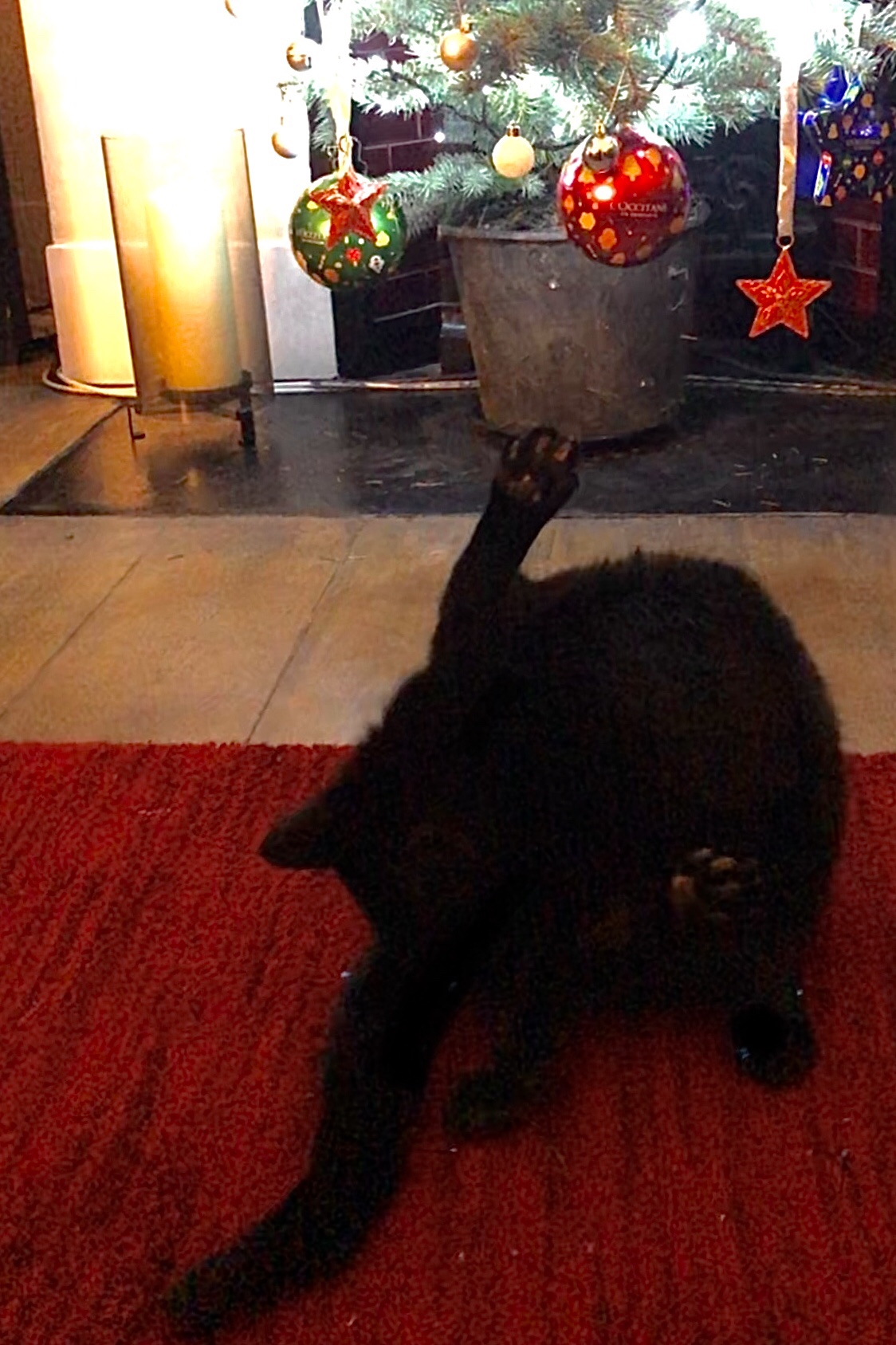 Here is the tree in all its splendour. And here is Catorze showing his gratitude in the only way he knows how: