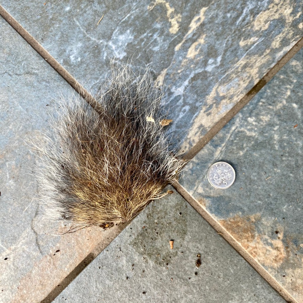 Earlier this week, Cat Daddy found this object (below, with a 5p coin for scale) whilst sweeping up the leaves at The Front. He thought it was a piece of faux fur from someone’s coat, but a few enquiries among my cat freak friends seem to suggest that it’s … a squirrel’s tail.