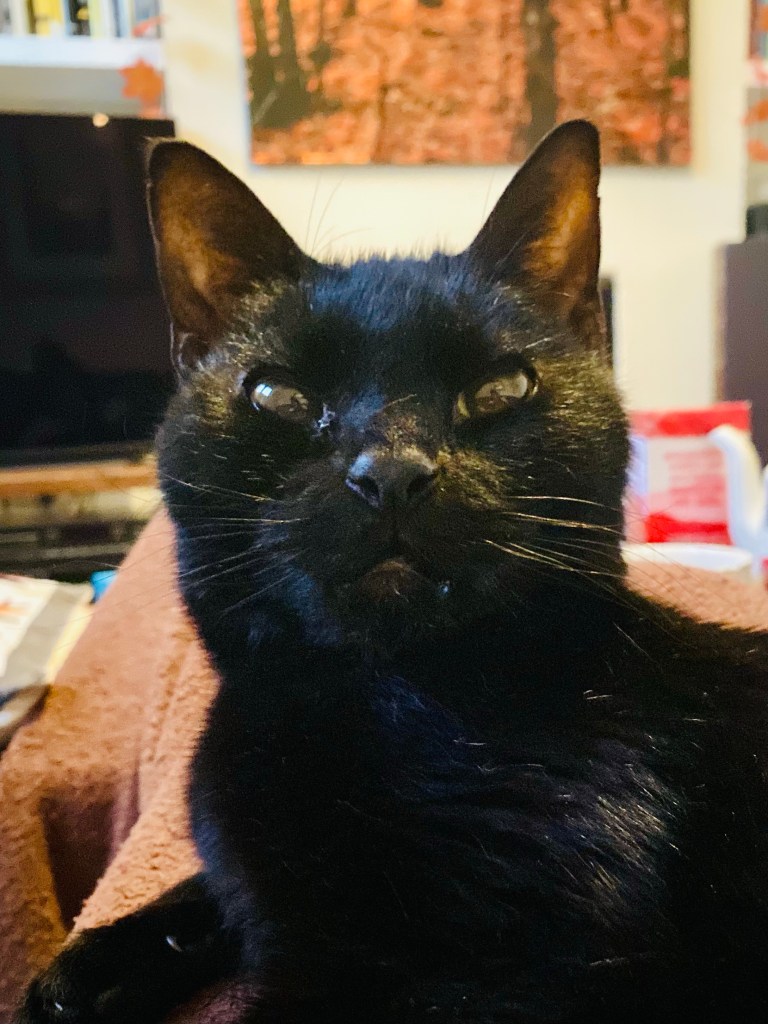 It was hard to take a good picture at this time (the morning after he came home), with the feeble living room light struggling to illuminate him and the unsightly backdrop of our coffee table with rubbish all over it, but somehow his chin and cheeks seem to sit differently. And, sadly, his trademark fangs don’t appear to protrude as much as they did before. Hopefully, as the swelling subsides, they will realign and he will look a bit more like the Roi that we all know and love. Right now it’s almost as if they swapped him for another cat, and the only reason I know they didn’t is because nobody in their right mind would swap him in rather than out.