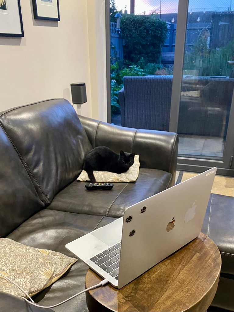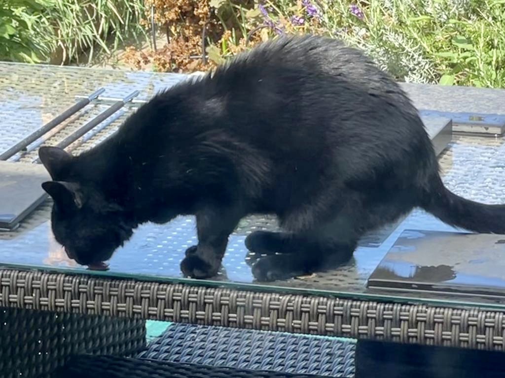 The one fragment of silver lining is that Catorze is thoroughly enjoying Cat Daddy being home. Whilst other events have been cancelled, It’s business as usual as far as Boys’ Club is concerned. The little sod has been pitter-pattering from Storm Watch to his papa’s lap and back again, stopping only to sip occasionally from his outdoor bar. I had spent the last week wondering why on earth he hadn’t been drinking any water from his glass and debating whether or not a vet visit were required when, in fact, there is nothing wrong with him and he’s just been doing this: