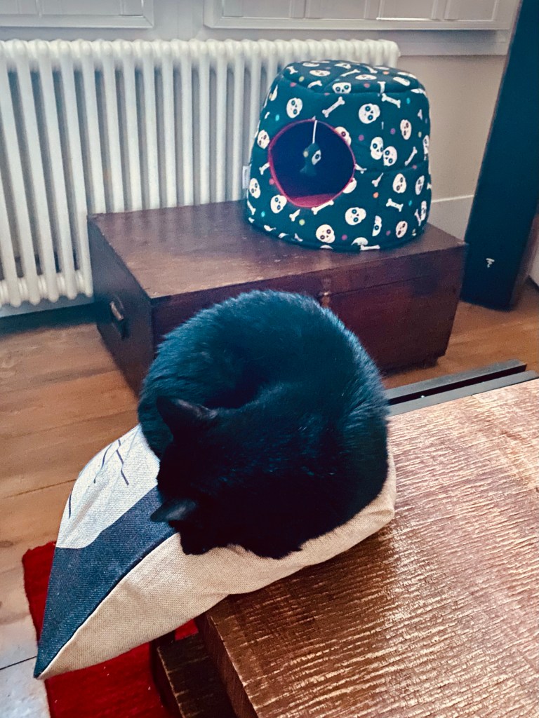 He has never shown any interest in this cushion in all the years we’ve had it sitting flat on the sofa. However, having it hanging precariously on the edge of the table, ready to drop off at the slightest move, has proven too much to resist. So much for cats sleeping in places where they feel safe.