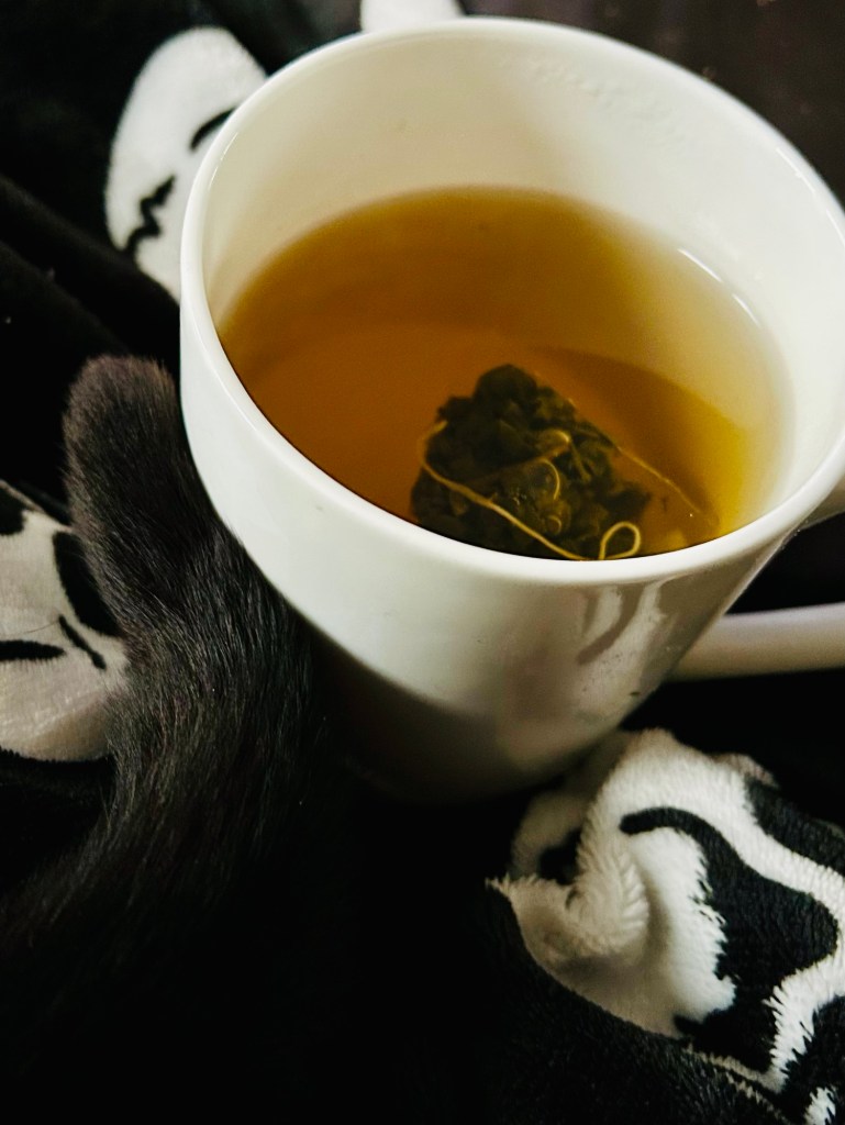 I like to think that Catorze enjoys this time, too. If, like now, we’re going through a cold snap*, sometimes he warms his tail on my cup of tea, like this:
