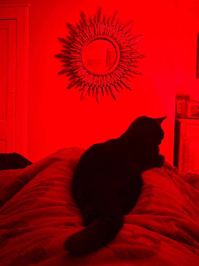 Most of the time I sleep through this. However, occasionally I’m semi-aware of my red lamp being switched off and a miniature cat being dumped onto my bed.