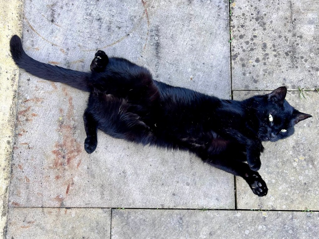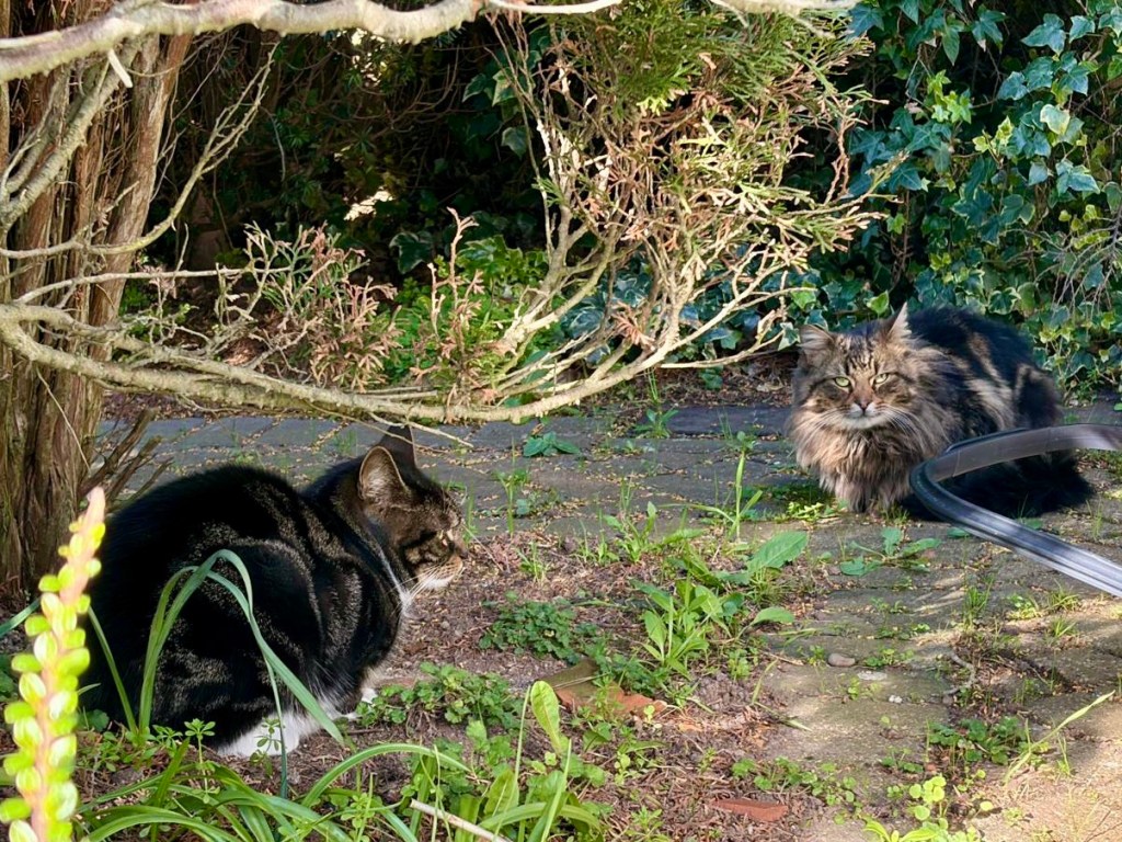 Meanwhile, on the south coast, Otis seems to have turned his garden into the local feline community centre. Idris, The Cat With The Human Face, is a frequent patron, although he only lives next door and was always around anyway. The bigger surprise is this fluffy newcomer. Who is s/he? And does s/he come in peace?