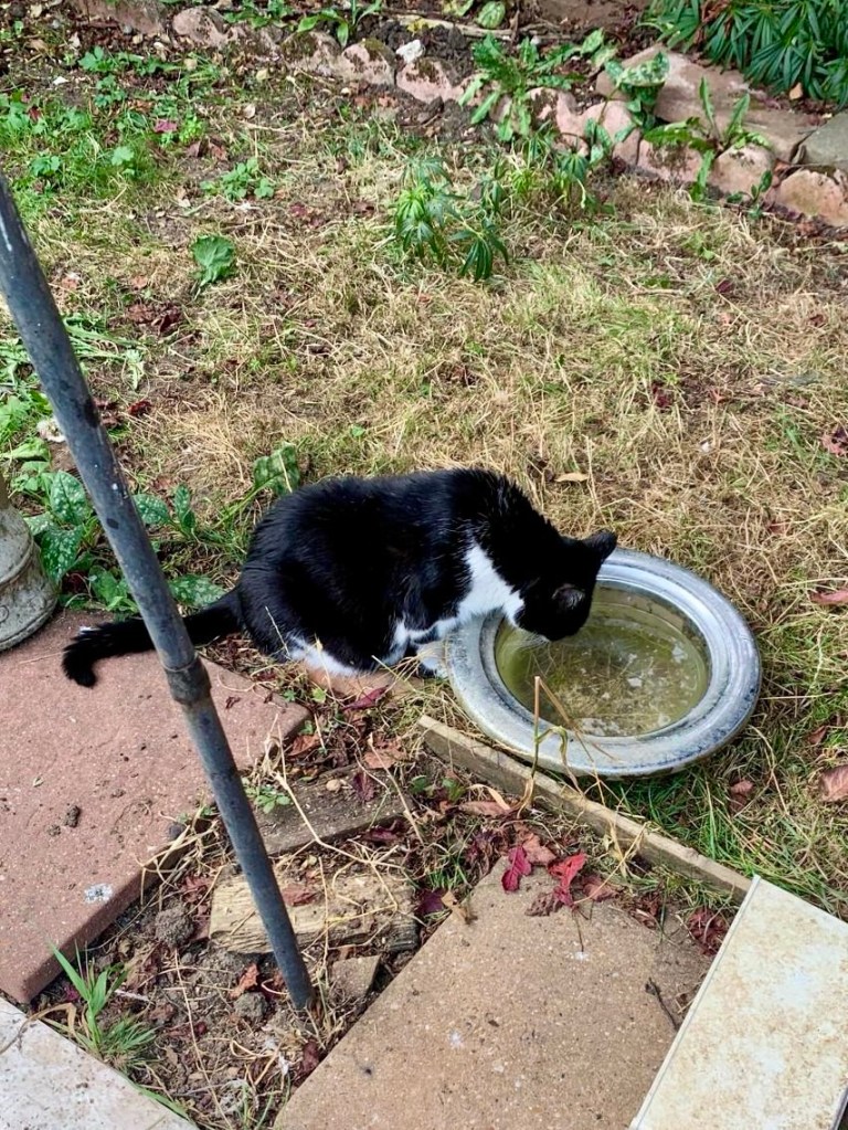 Le royal wine glass, during the glorious days before Cat Daddy kicked it over and broke it.The outdoor bar.The cess pool of horrors.Bonus photo of Catorze’s cat-auntie, Zelva, drinking from the water that my mum leaves out for the foxes in an upcycled washing machine door. (She has her own cool, boiled water indoors.)