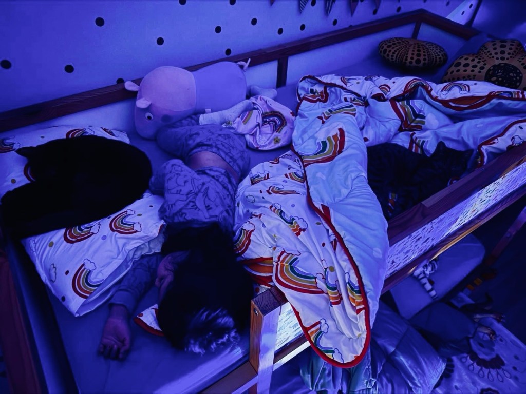 Here they are, happily snuggled up in their human sister’s bed. But just look at Rodan, on her pillow: