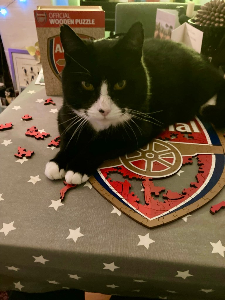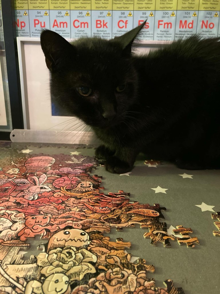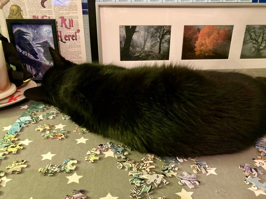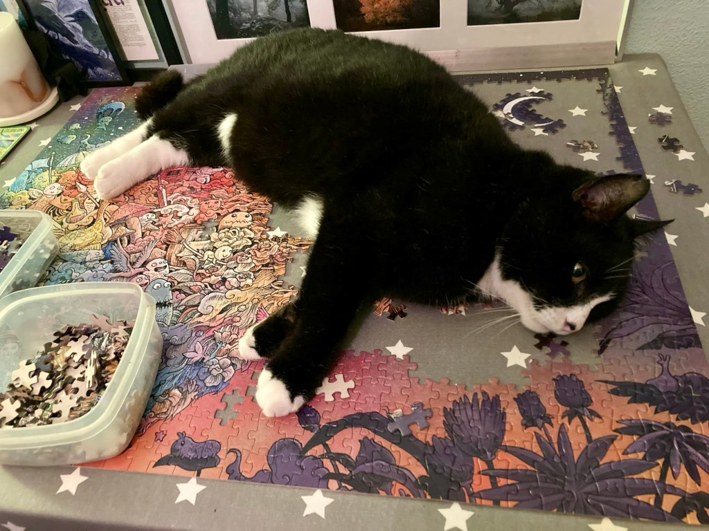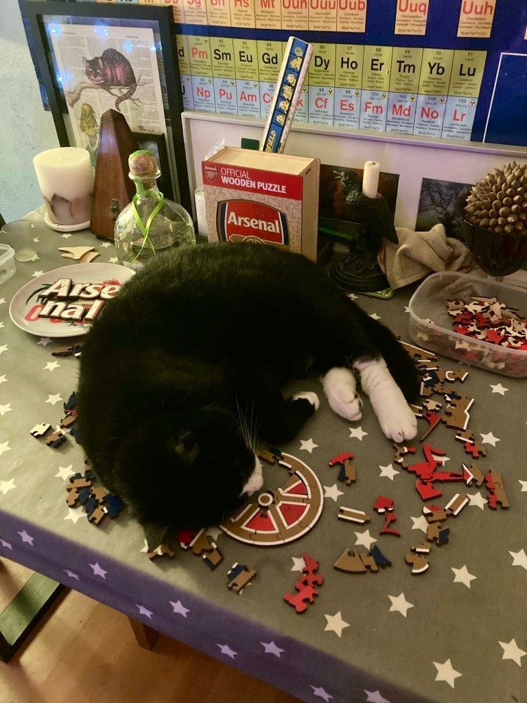 Antoine and Boots can’t resist lying on an in-progress jigsaw puzzle and preventing their maman, Lizzi, from progressing. Lizzi has even been known to construct barriers to protect her work, but to no avail. Boots, in particular, is so bullish and ungainly in his movements that he has been known to dislodge pieces, and it’s only a matter of time before one, other or both cats sit on the puzzle and end up with a piece stuck on their arse.