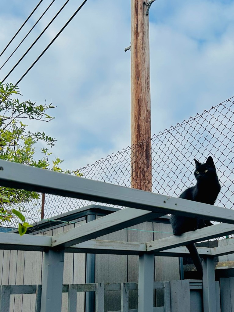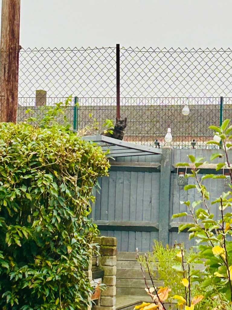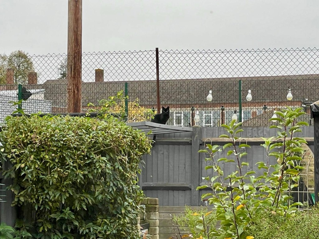 Louis Catorze’s new favourite place is atop the trellis which would have held our honeysuckle plant, had it decided to actually grow properly.