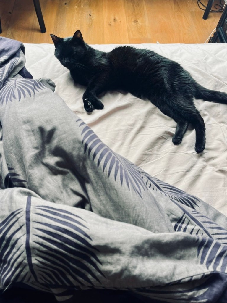 Look at him, lounging around on the chat-sitteur’s bed like he’s King of the World: