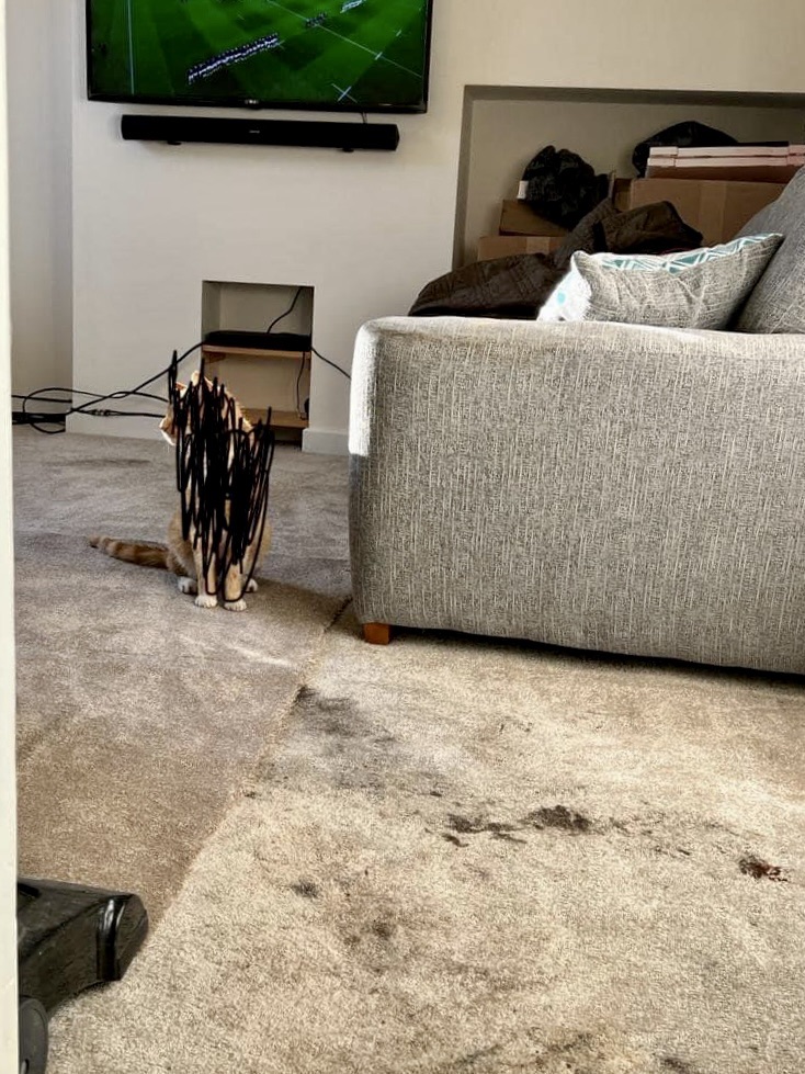 I stopped scrolling after a few because some of the “before” shots were truly stomach-churning. One of the less awful ones showed a carpet covered in mud, with a cat sitting beside it. And the person posting has used the iPhone markup tool to obscure the identity of the cat: