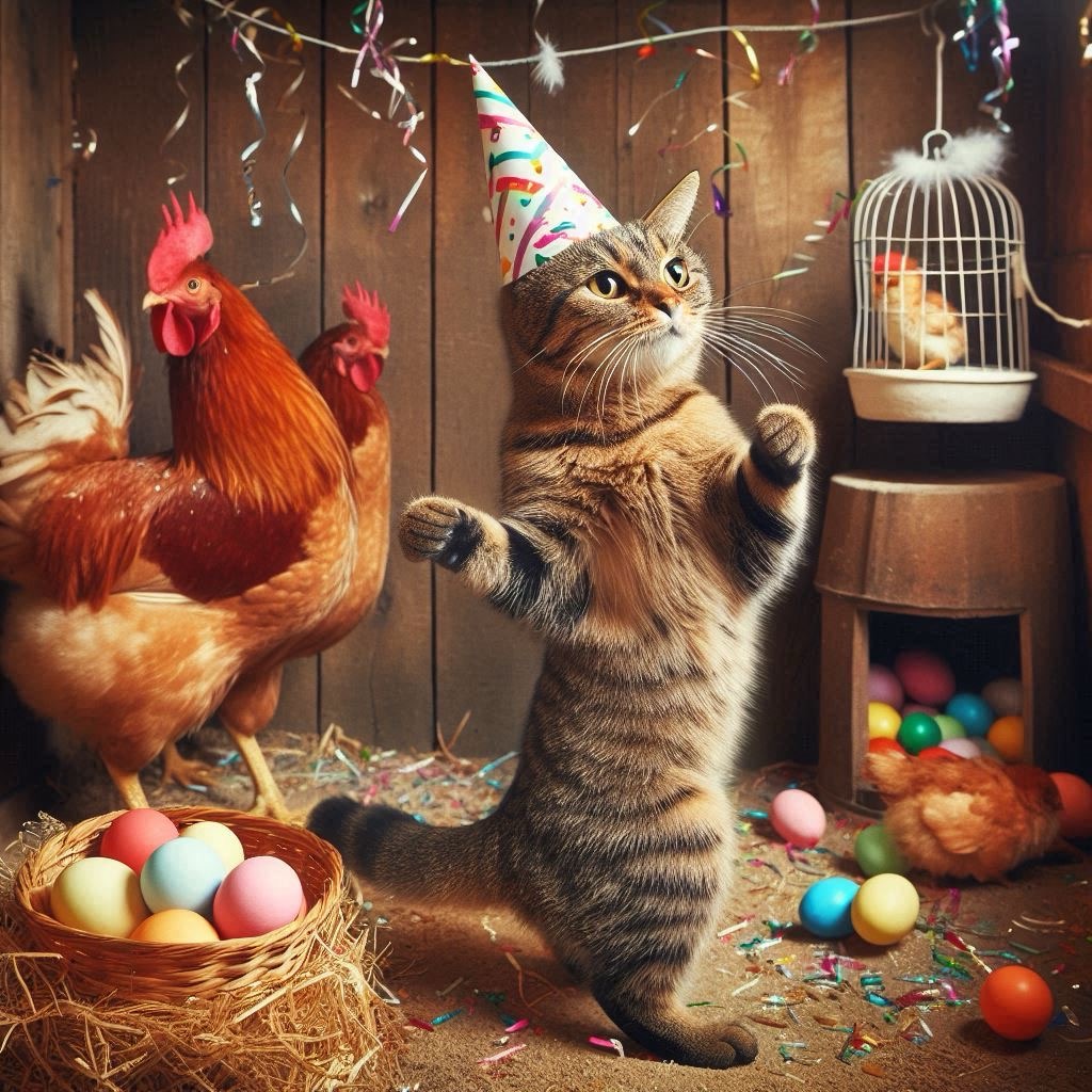 Catorze’s cat-cousin Otis, however, would invite next door’s chickens. After all, they were kind enough to host him the other night, not just for dinner but for an overnight stay, so the correct protocol would be to return the gesture, non?