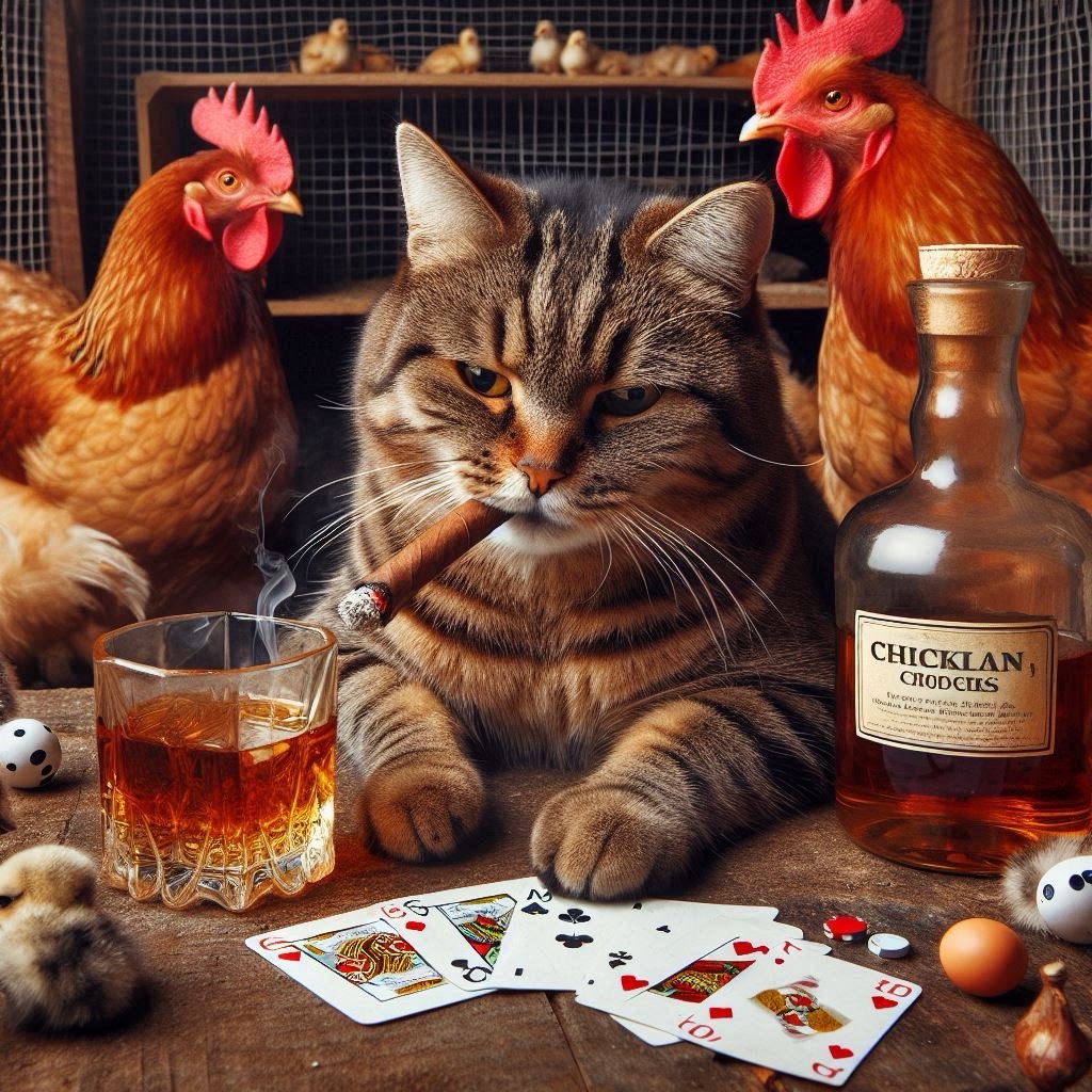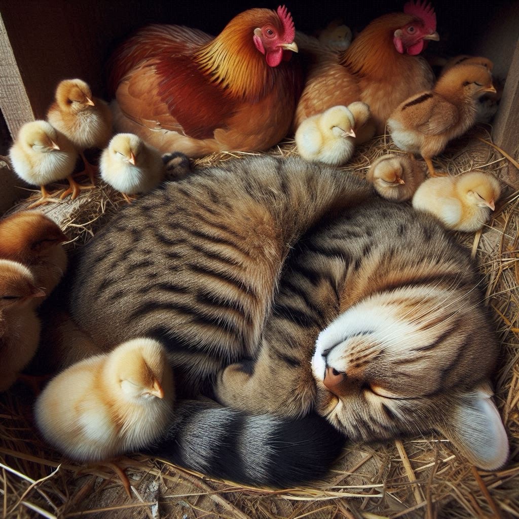 Otis was also fine, although unusually tired. We don’t know what went on during those eighteen (!) lost hours, nor will we ever find out – after all, what happens in the coop stays in the coop. But the AI Bot has a few ideas.