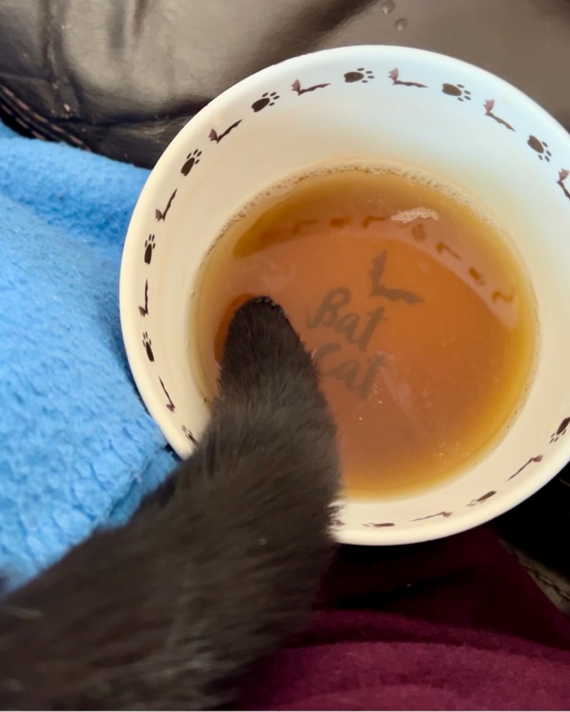 Louis Catorze has just dipped his tail into my tea. This has happened before but, on this occasion, he kept it in the cup and swished it around a couple of times. And, when he lifted it back out, he slapped it first onto the sofa and then onto my clothes.