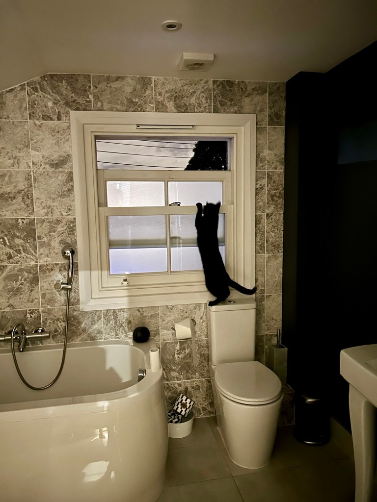 For a while I ignored it, thinking he had jumped down to ground level, come in through the cat flap and started annoying Cat Daddy. Catorze’s screams are loud enough that they can be heard from another floor in the house. However, that wasn’t what had happened. The stupid little shite was still outside the bathroom window, and appeared to be stuck.