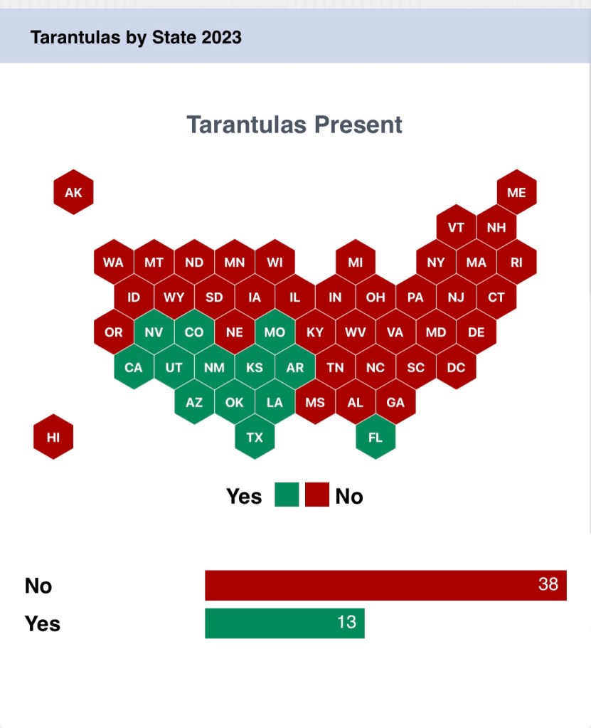For whatever reason I decided, last week, to check which US states had native tarantulas, expecting it to be just Oklahoma, Florida and perhaps a couple of the desert ones. I had no idea it would be as many as this, including Colorado (where we have friends and family members who have invited us to visit – it’s now a firm NOPE to that) and Louisiana (where we’d hoped to go on holiday next year – it’s a firm NOPE to that, too).