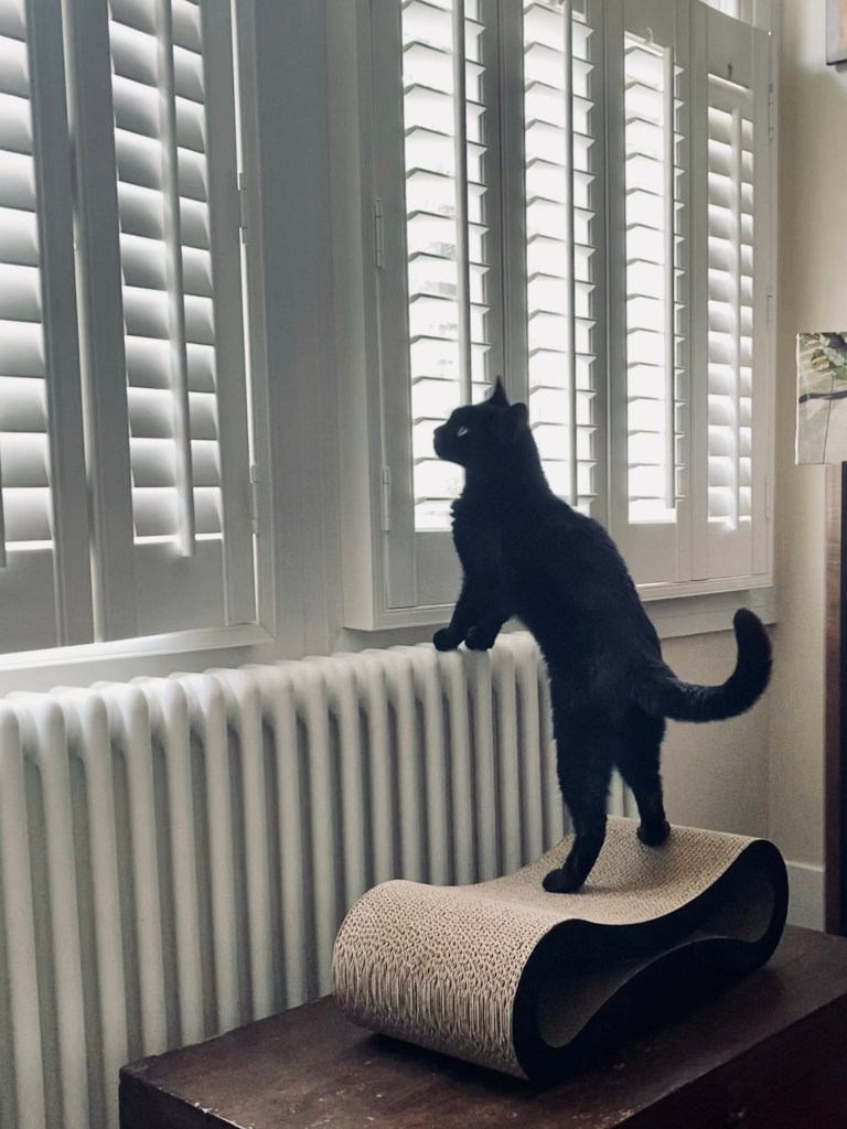 Not even a second after those words had left him, Catorze jumped off my lap, ran to the window and headbutted the shutters.
