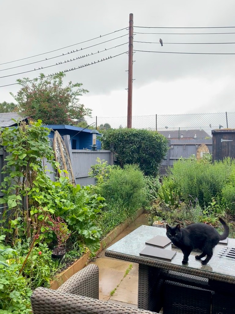 Whilst we debate these intellectual and highbrow issues, here is Catorze, fresh from – yes you’ve guessed it – gadding about in yet another storm, and taking a drink from the water pooled on the table. And look at the army of birds in the background, who daren’t come down to feed until the apex predator has moved his arse: