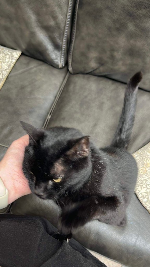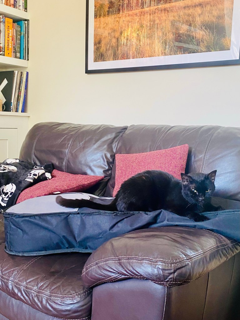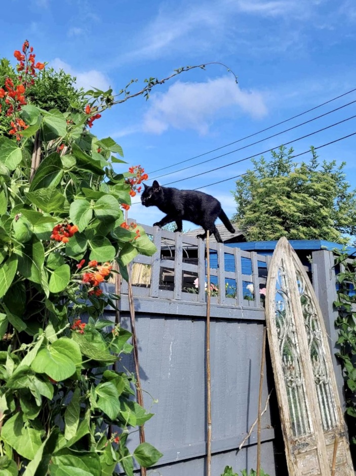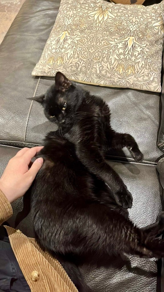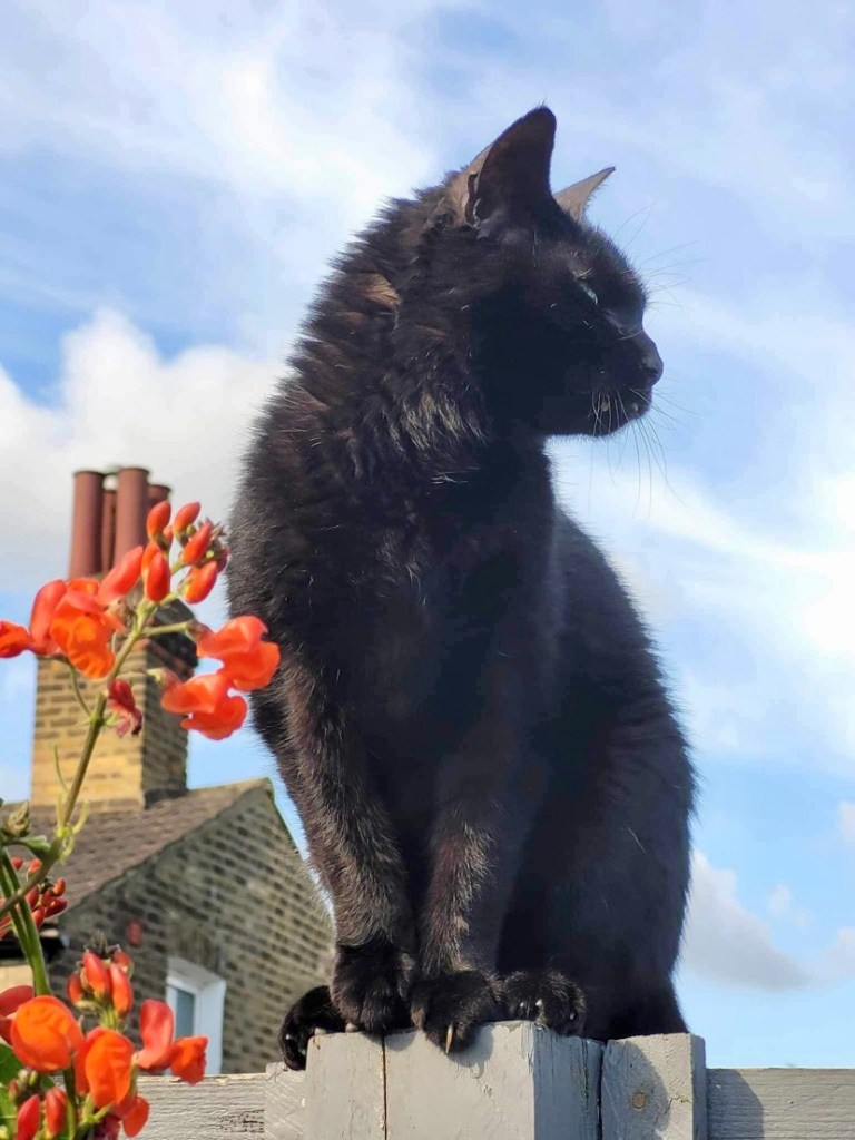 He was in and out all night, stopping only to batter at the shutters so that I would let him out at The Front (denied) and, when I decided to take myself to bed to get away from him, he followed me upstairs, sat on my chest and creepy-stared at me.