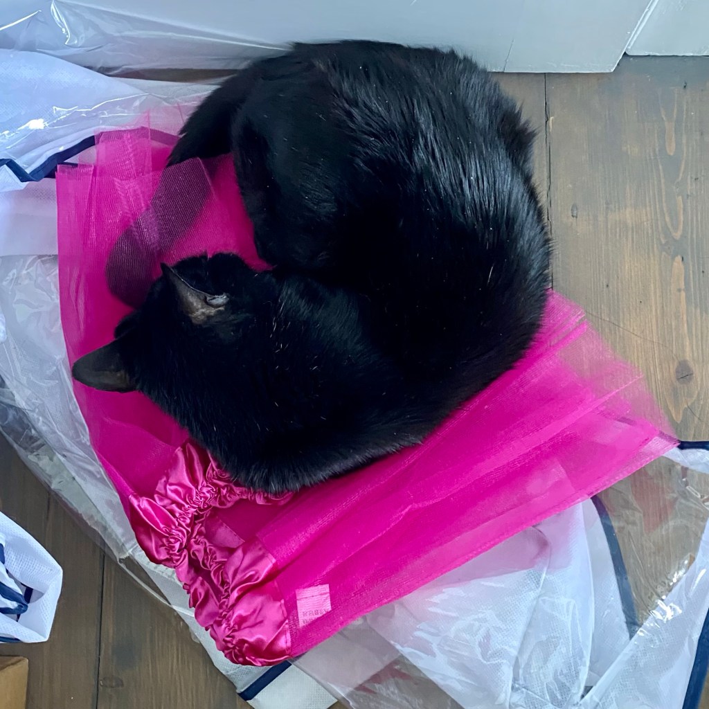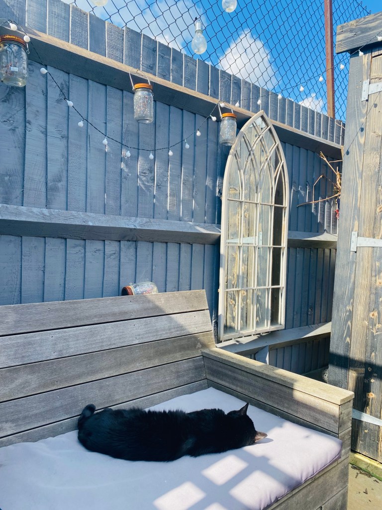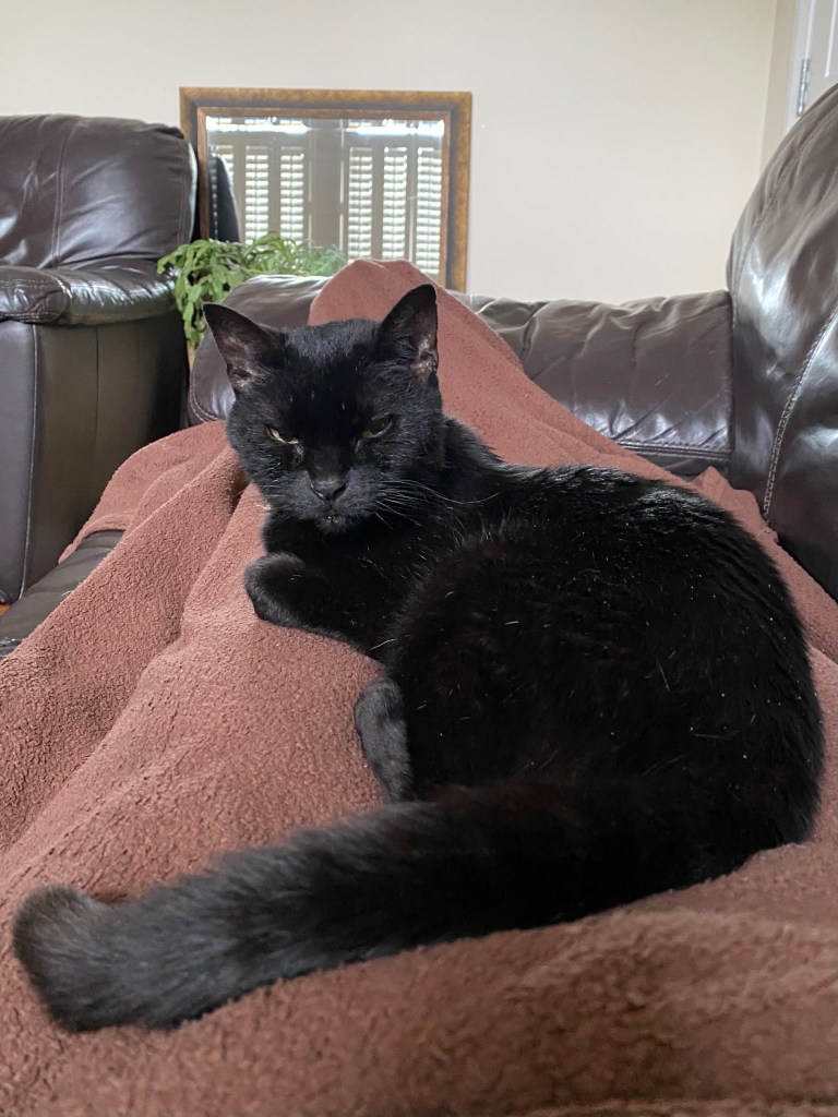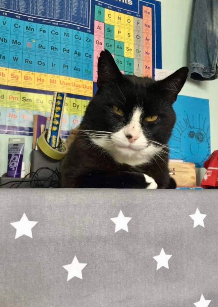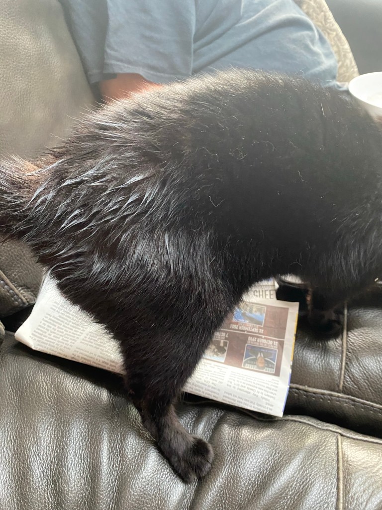 He was in and out all night, stopping only to batter at the shutters so that I would let him out at The Front (denied) and, when I decided to take myself to bed to get away from him, he followed me upstairs, sat on my chest and creepy-stared at me.
