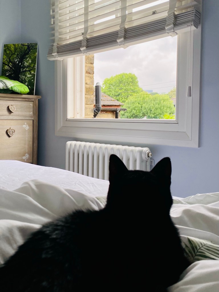 As ever, there is online panic, with people on my local neighbourhood forum telling cat owners to keep cats indoors. However, I disagree. Unlike dogs, who would blindly follow their owners across hot lava if they had to (and even if they didn’t have to), cats won’t do things that they don’t want to do. Also, if cats are used to going outside and they enjoy it, keeping them in would drive them round the bend; we would be able to hear Catorze’s screaming even from up here. So we have just told our neighbours to feed him smaller portions, keep an closer eye on the levels of his one water glass, and let him do as he wants. (He doesn’t need extra water glasses; trust me, he won’t drink from them. And, when the fan is switched on, his ears flick back and he moves away.)