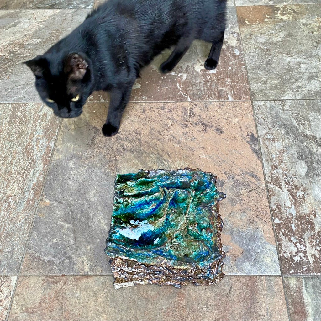 When we returned to Lotte’s place the next day to collect the book, a second piece also caught our eye. This one is called The Iron Pool, and we hope that it will provide the birds with some much-needed water in this heatwave whilst also being high-sided enough to keep it from inquisitive Catorzian paws/tongues. We love the fact that it looks like an earth-toned flower from a distance but, when you approach, there’s a surprise blue loch inside: