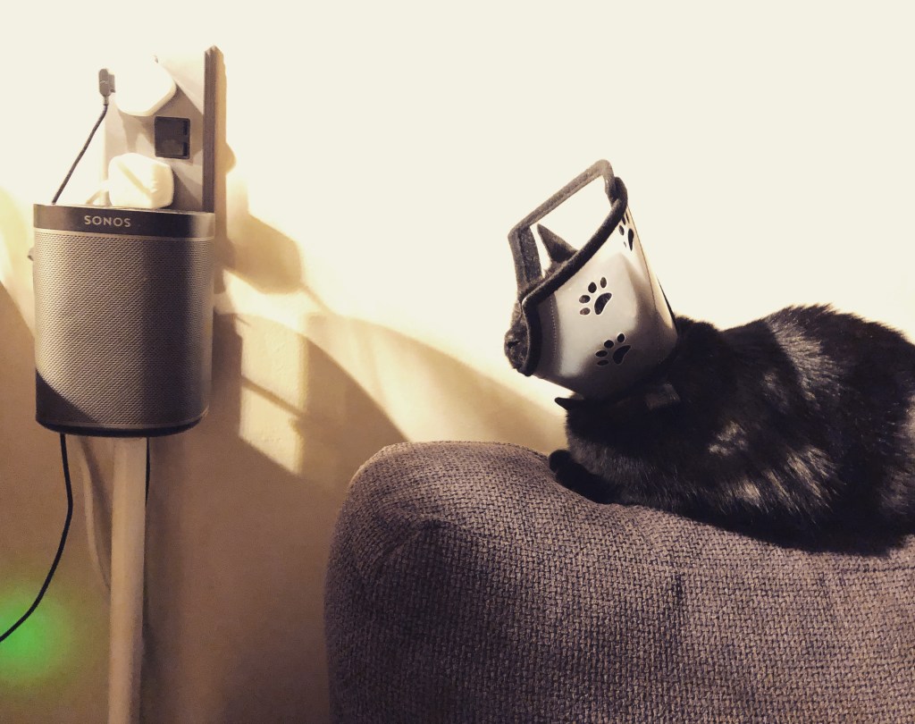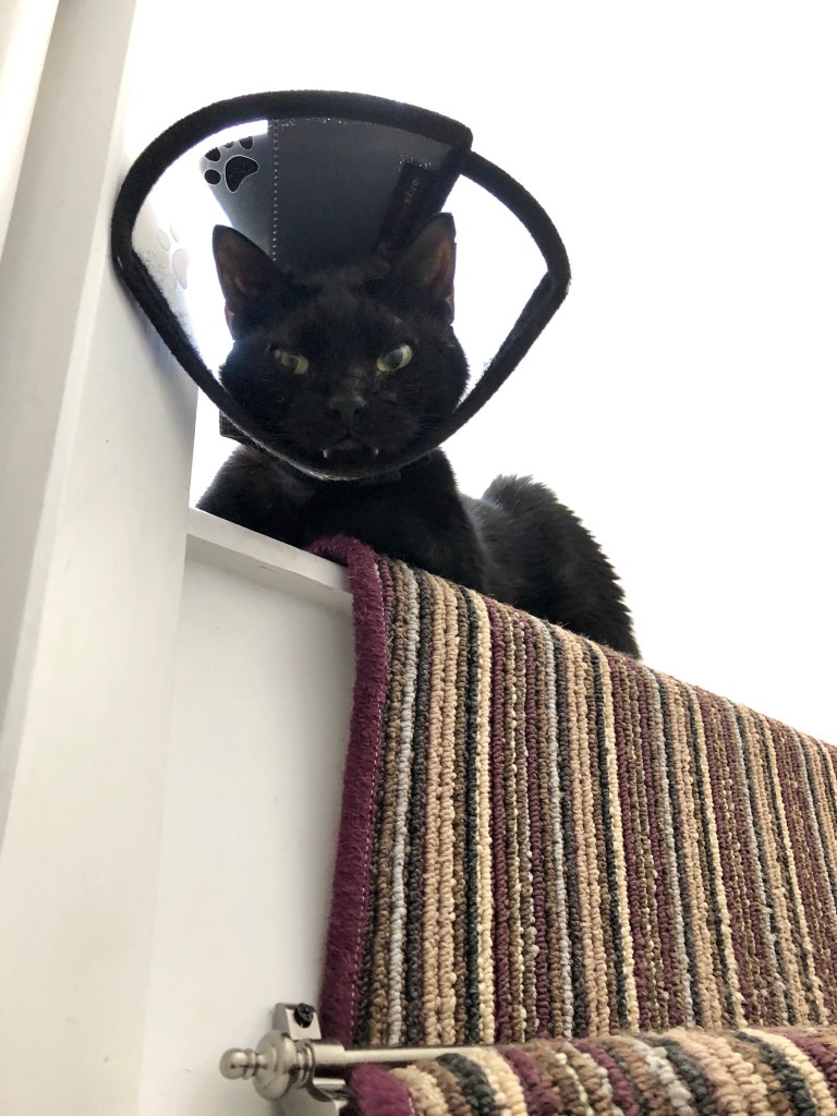 Here is the little sod, taking a rest between reps (mine, obviously, not his) on top of my jumper and my resistance band, with his disapproving face on display for all to see: