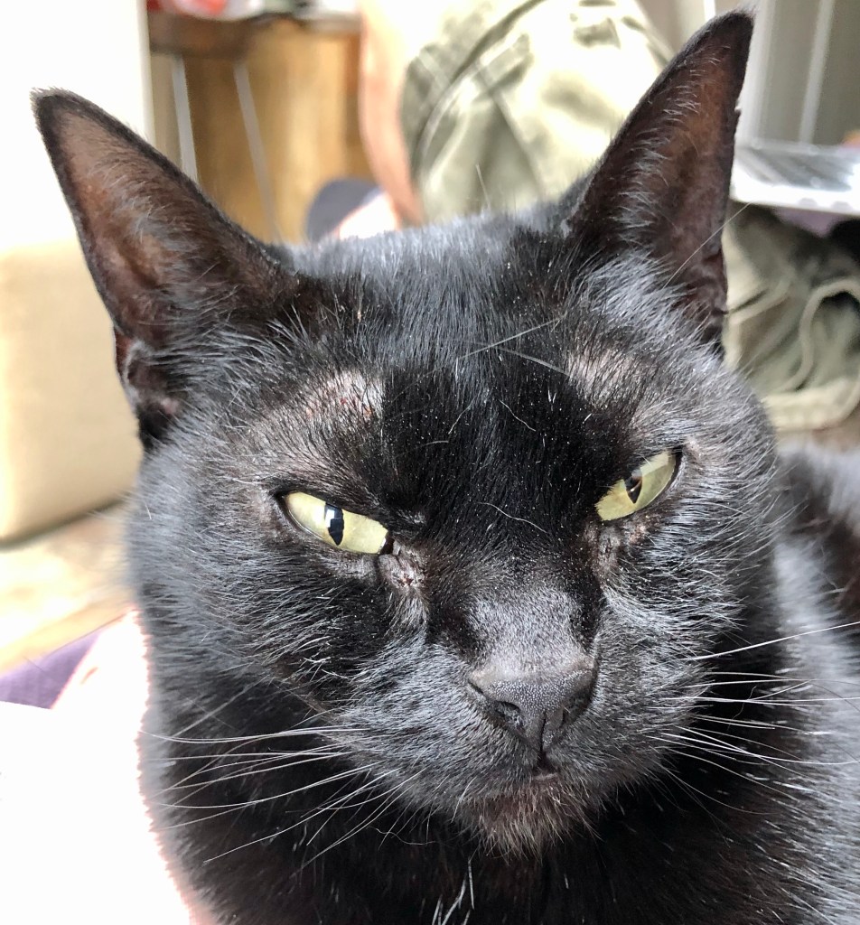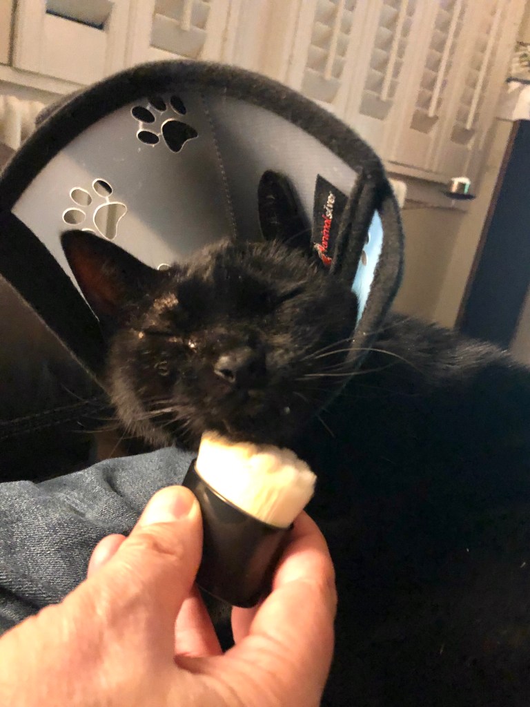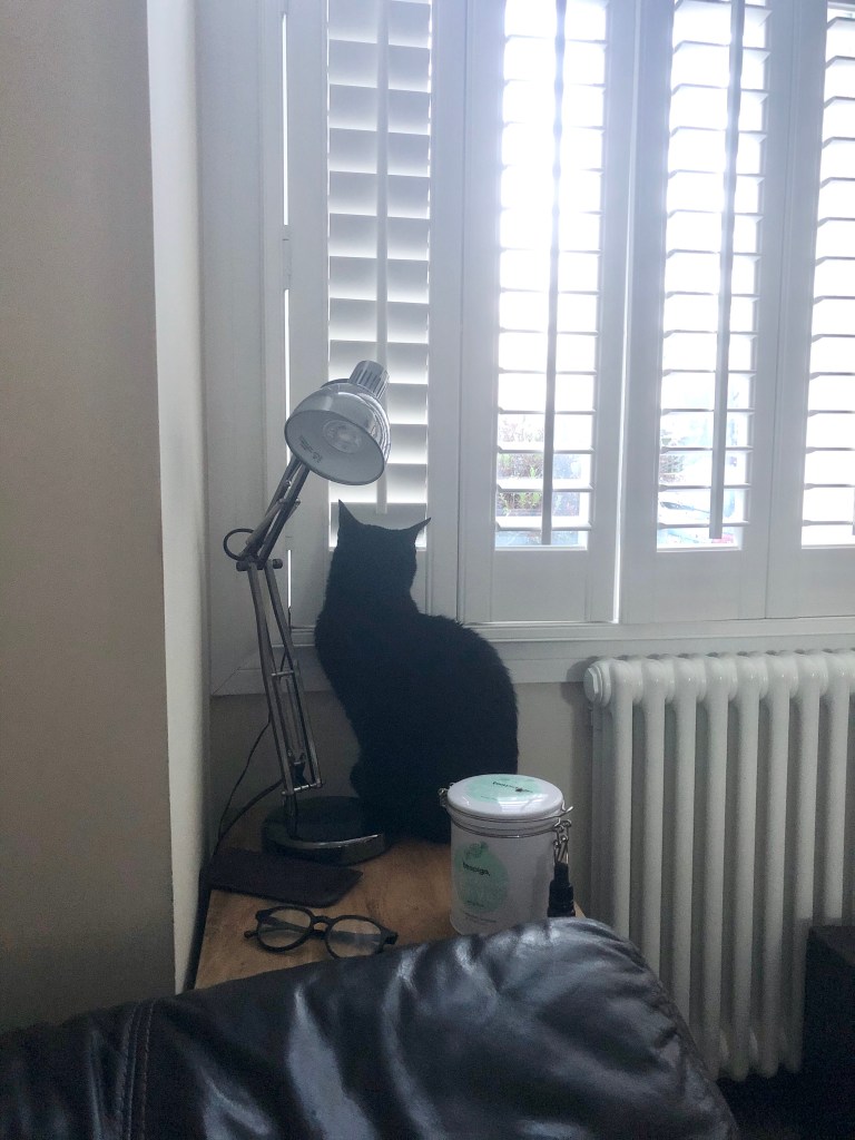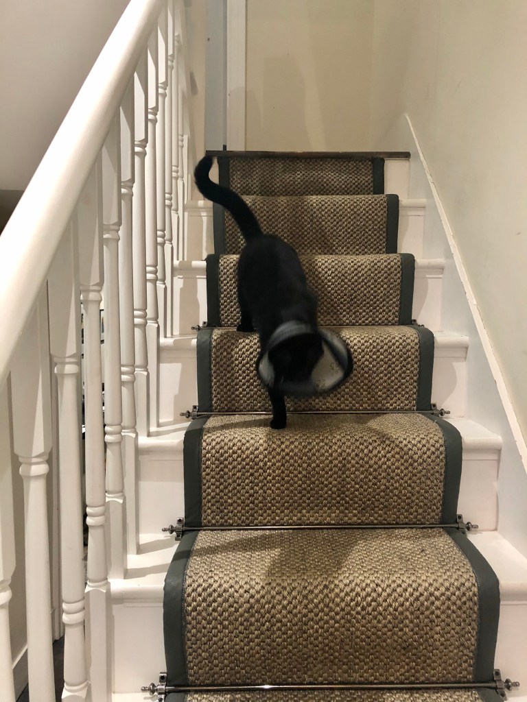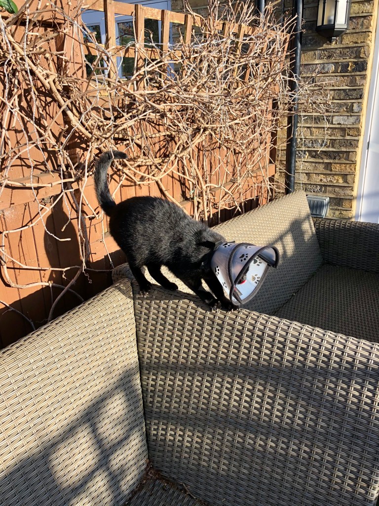 I found him only half-Côned when I woke up one morning, despite the fact that Cat Daddy and I had agreed never to leave him that way unsupervised. My immediate assumption was that Cat Daddy had forgotten to fully-Cône him after a riotous Boys’ Club of Jägerbombs, absinthe shots and suchlike. But it turned out that he HAD remembered, and now the little sod has lost the detachable section. Furthermore, we haven’t the faintest idea where it is.